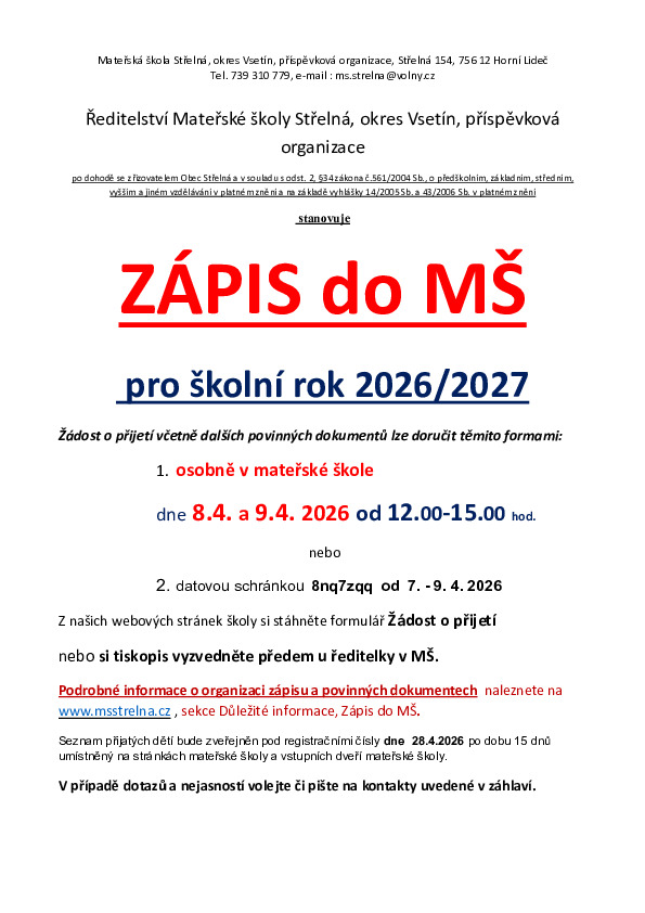 Zápis do MŠ Střelná - plakát